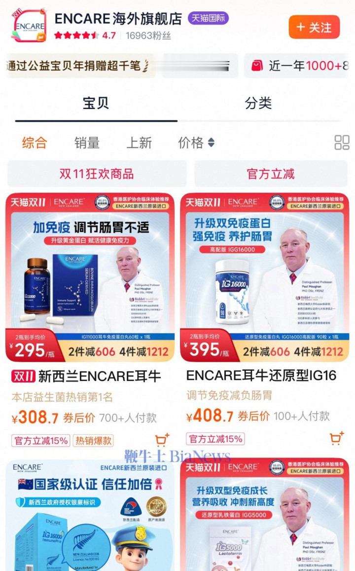 从刘嘉玲曝光的截图来看,涉事店铺为天猫国际体系下的“ENCARE海外旗舰店”,其售卖的一款“新西兰ENCARE耳牛免疫球蛋白”保健品,商品首页显眼位置放置了梁朝伟的肖像照。